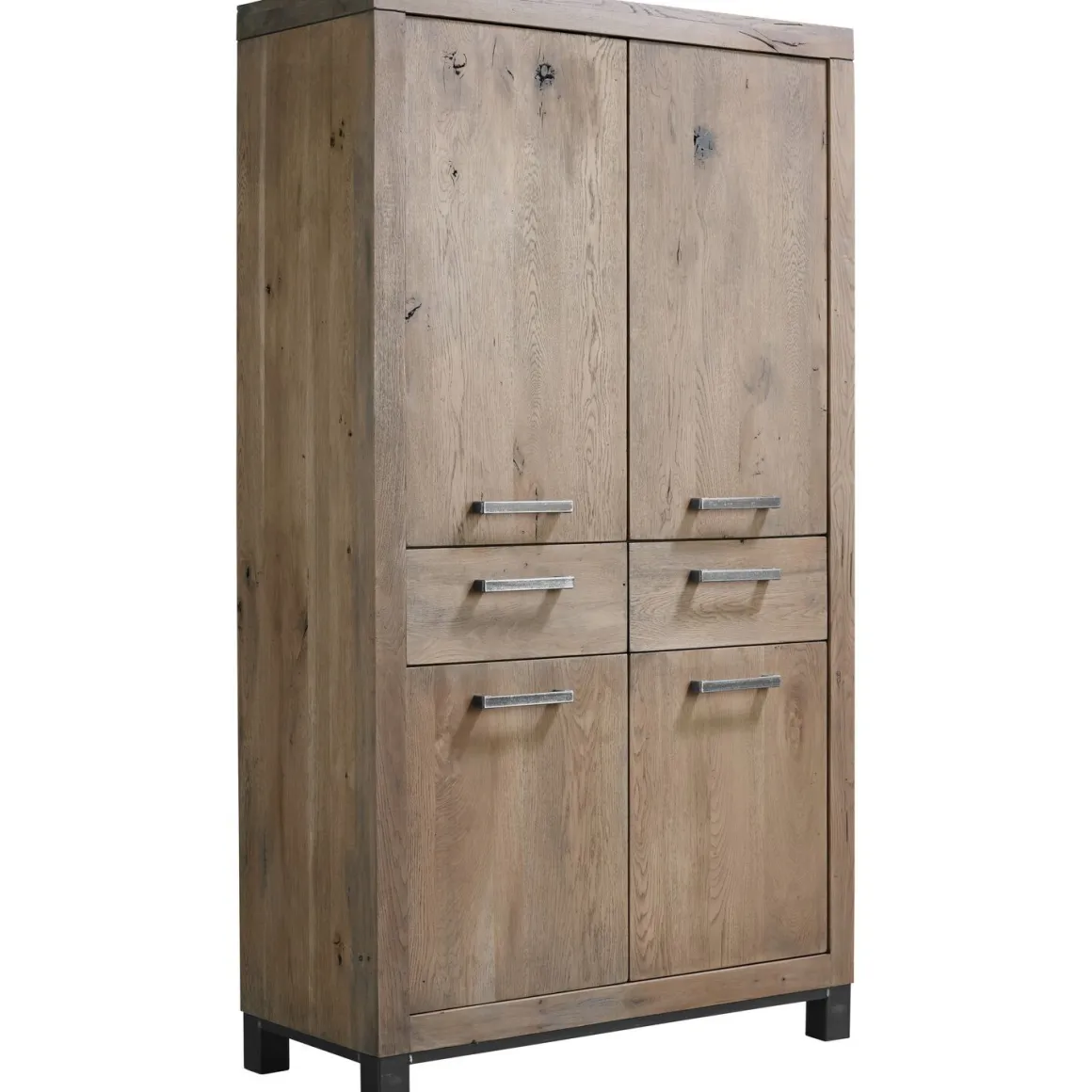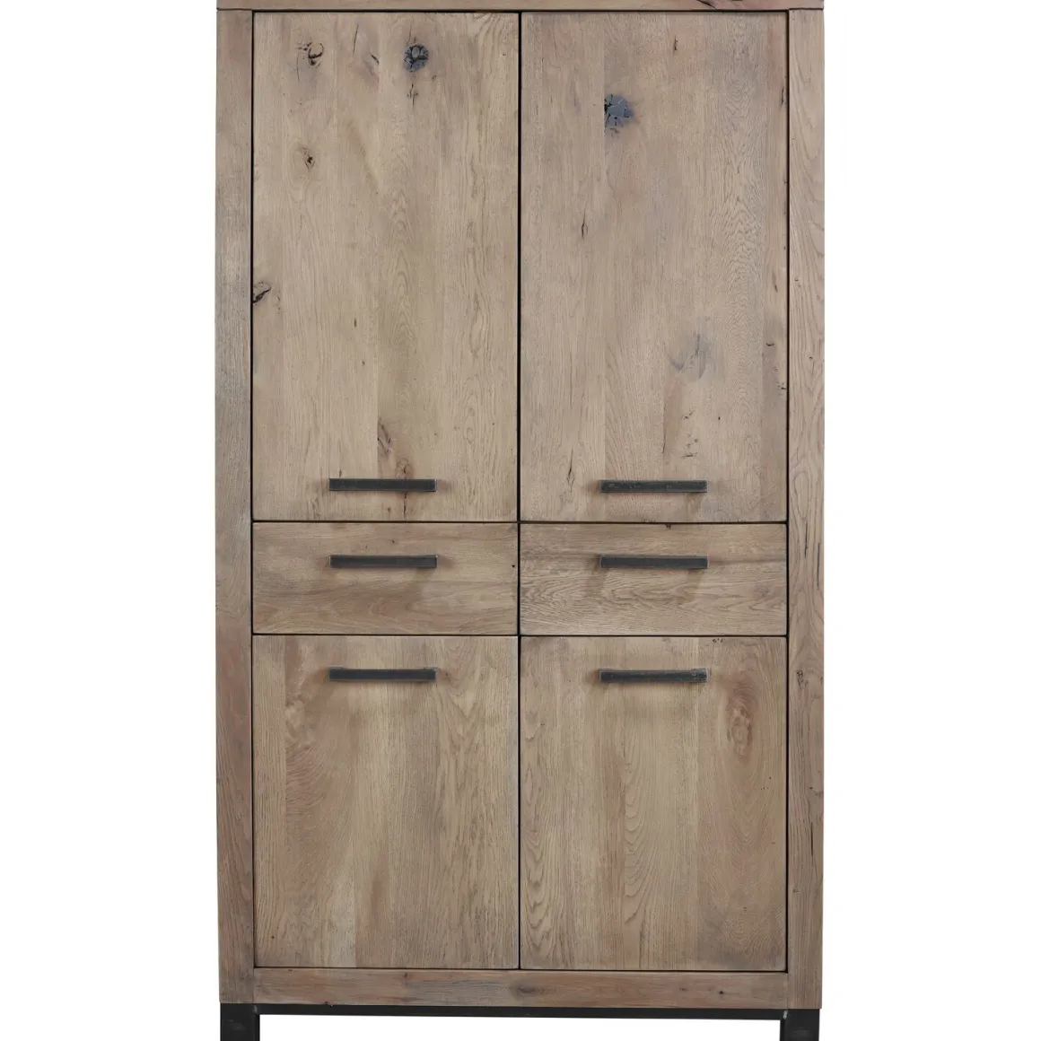 Deze robuuste opbergkast Hevano is gemaakt van eikenhout met een grof gelast stalen onderstel. Eikenhout kenmerkt zich door de fijne nerf, vlamtekening en de wisselende kleurschakering. Elke boom heeft een eigen uitstraling door de groei en weersinvloeden. Structuur, nerfschakering, windbarstjes, haarscheurtjes en de aanwezigheid van grote en kleine knoesten getuigen van jarenlange groei en maken het hout van de boom authentiek.