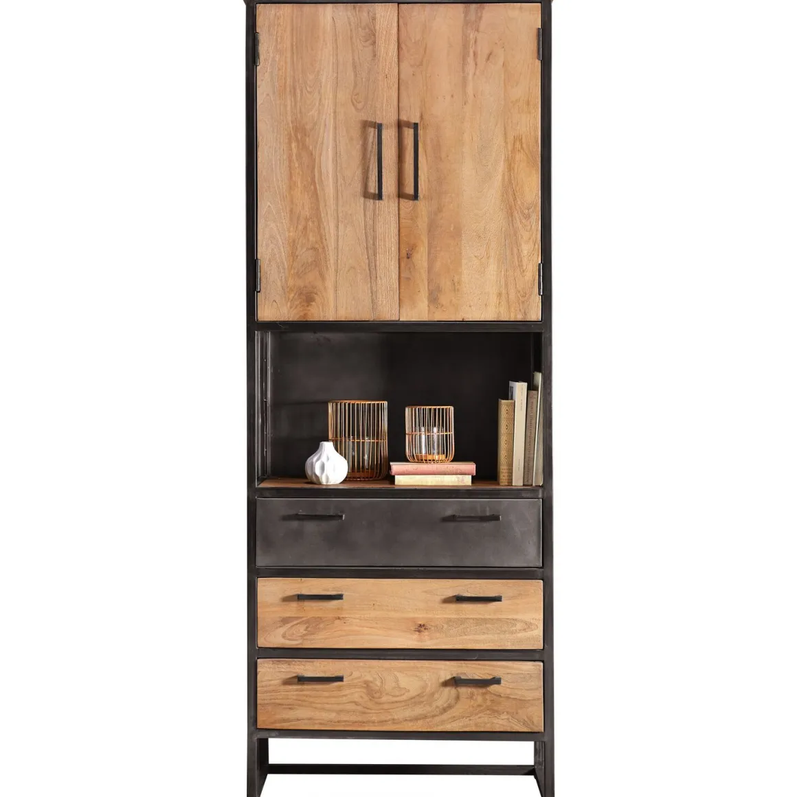 De kast heeft 2 deuren, 3 lades en 1 open vak. Het open vak heeft een hoogte van 39 cm en een breedte van 70 cm. Deze kast is ideaal om je leuke accessoires of boeken een plekje in het zicht te geven, maar ook om spullen ongezien in op te bergen. Met een hoogte van 202 cm en een breedte van 76 cm, biedt deze kast veel opbergruimte. Achter de deuren bevindt zich een vaste legplank.