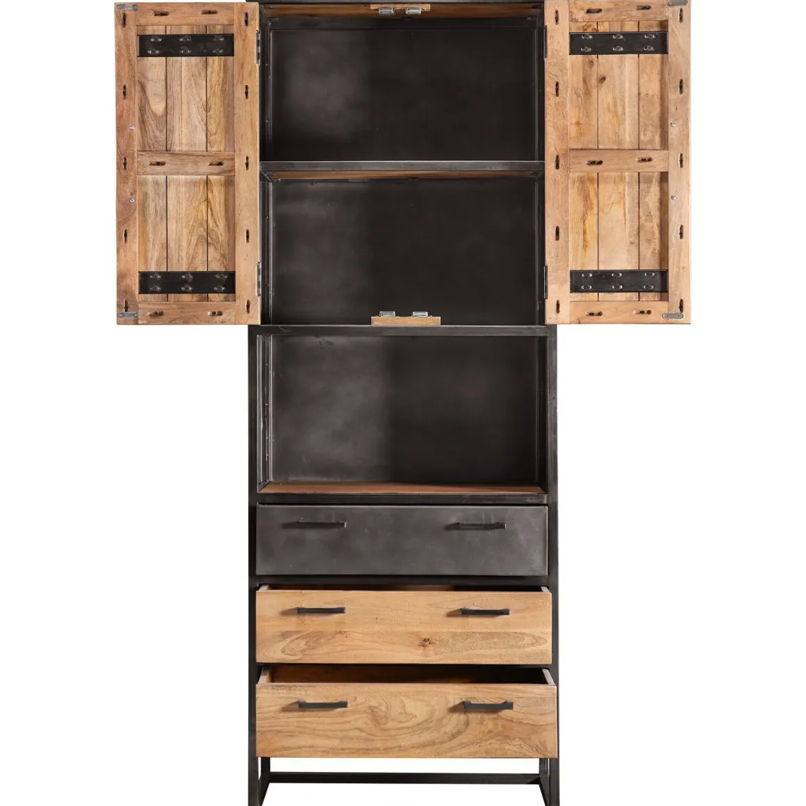 | Uitvoering | Uitgevoerd in mangohout natural met antique metalen frame, met 2 deuren, 3 laden en 1 open vak. |