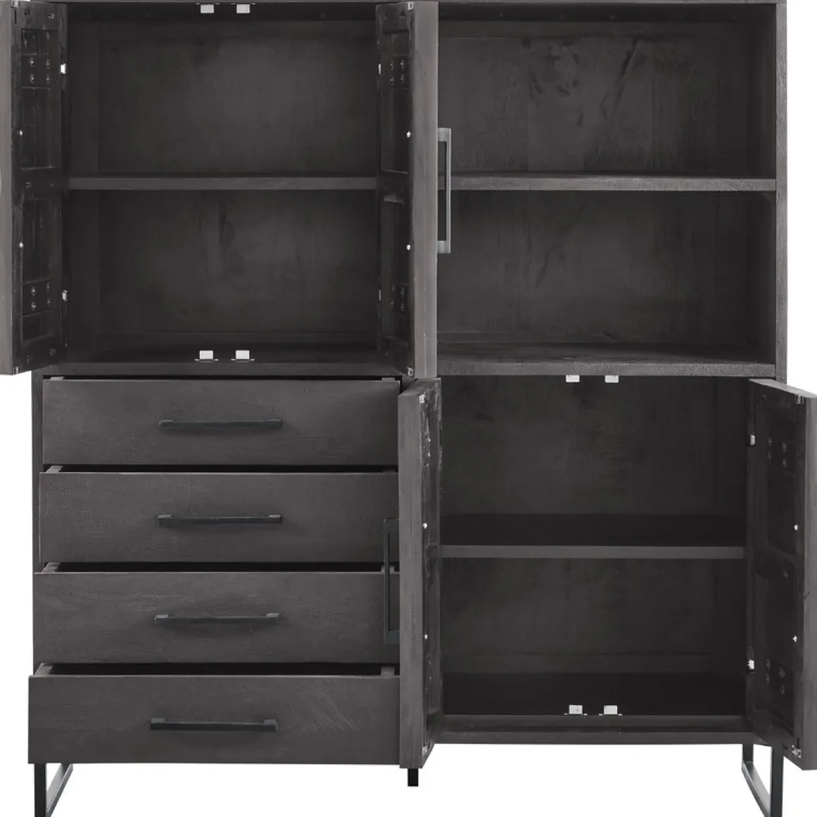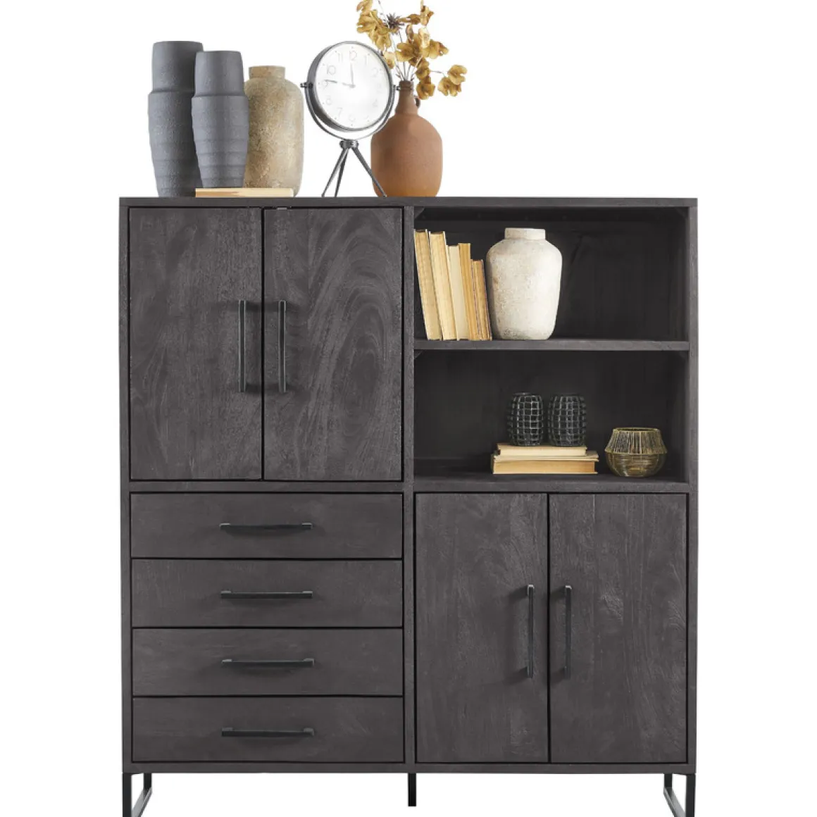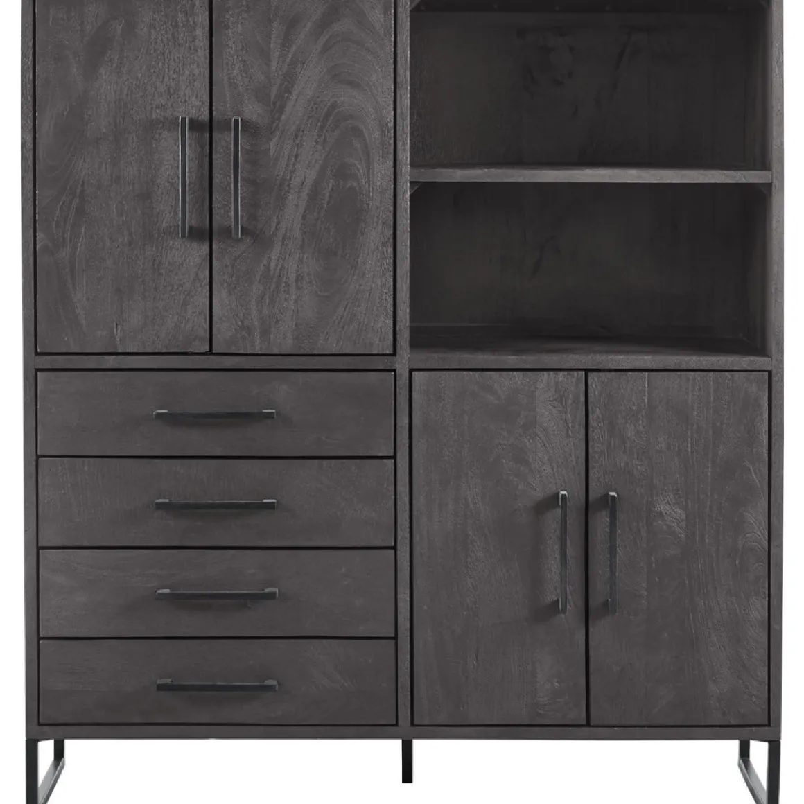| Uitvoering | Uitgevoerd in gezandstraald mangohout in de kleur deep black en een zwart metalen frame, met 4 deuren, 4 laden en 2 open vakken. |
