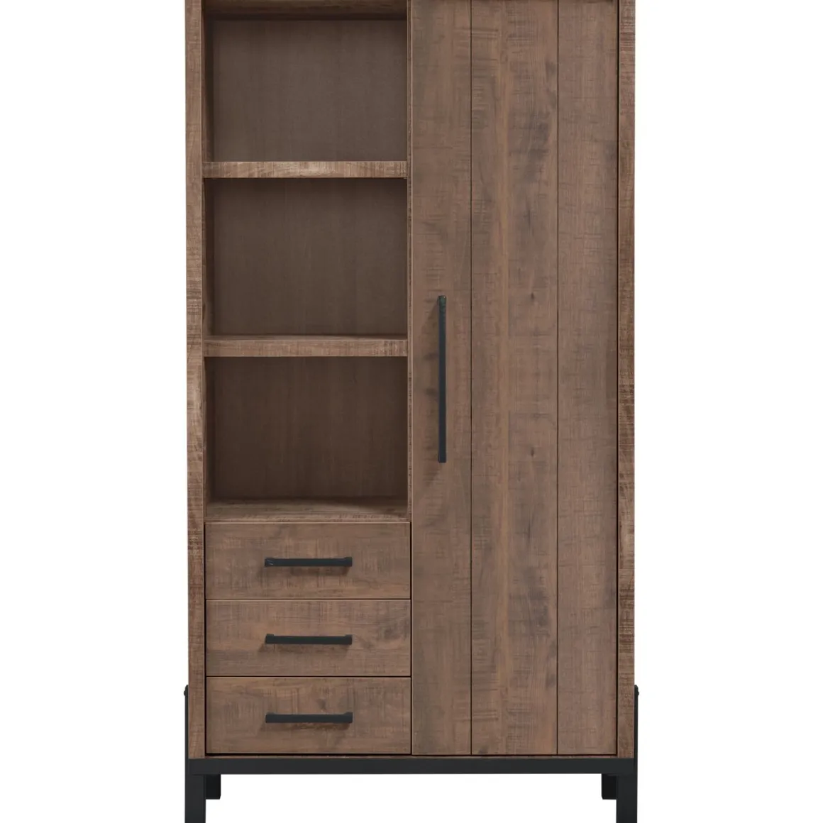 | Uitvoering | Uitgevoerd in melamine met dark mango decor in combinatie met zwart metalen frame, met 1 deur, 3 laden en 3 open vakken. |