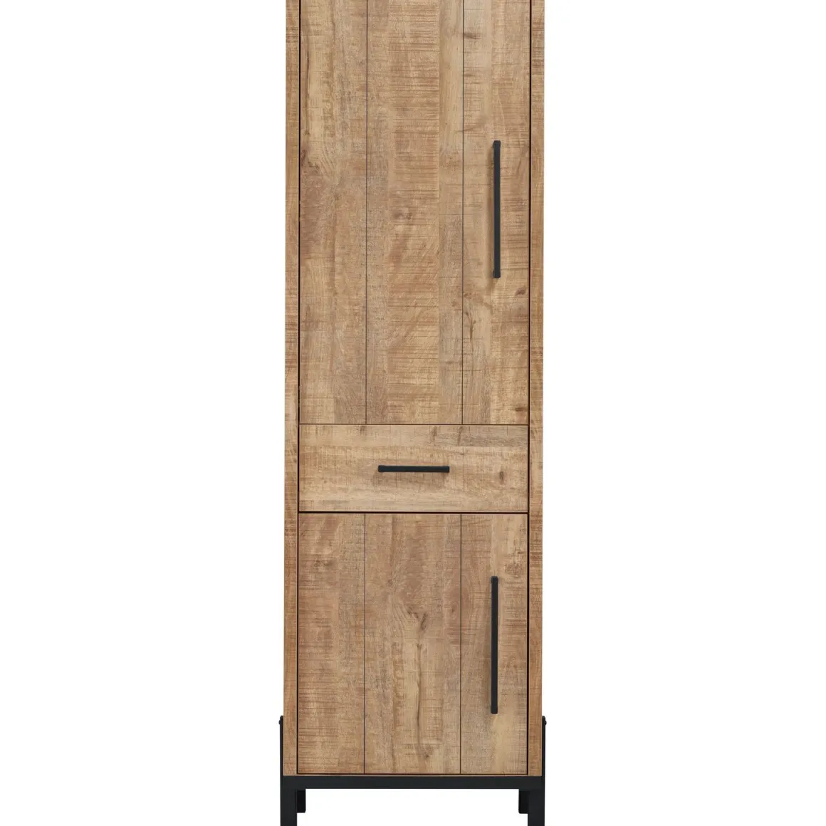 | Uitvoering | Uitgevoerd in melamine met mango decor in combinatie met zwart metalen frame, met 2 deuren en 1 lade. | De deurtjes zijn zowel links- als rechtsdraaiend te monteren. |