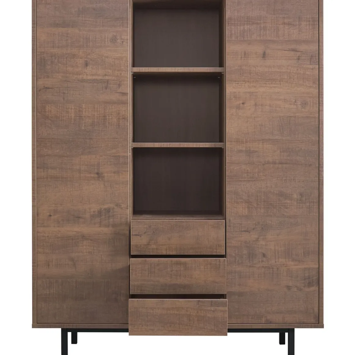 | Uitvoering | Uitgevoerd in melamine met dark mango decor in combinatie met zwart metalen poten met 2 schuifdeuren, 3 laden en 3 open vakken. |
