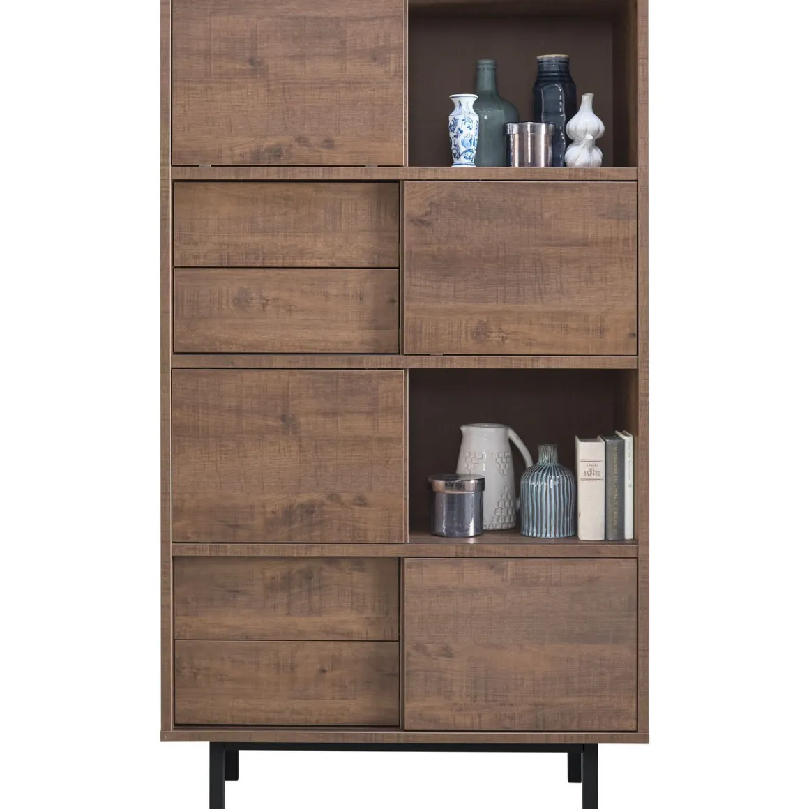 | Uitvoering | Uitgevoerd in melamine met dark mango decor in combinatie met zwart metalen poten met 4 schuifdeuren en 4 laden en 2 open vakken. |