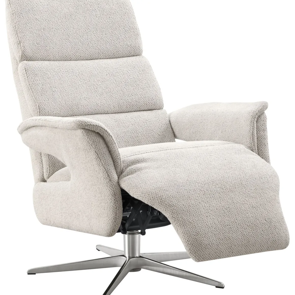 De draai- en relaxfauteuil Initio is uitgevoerd in de stof Macan in een lichte grijze kleur, een sterke, slijtvast geweven stof met chenille garens, die een zacht en fijn gevoel geeft. De weefstructuur heeft een klassieke, luxe uitstraling en past perfect bij de huidige interieurtrends. De aluminium 5-teens poot voegt een modern accent toe en zorgt voor stabiliteit.