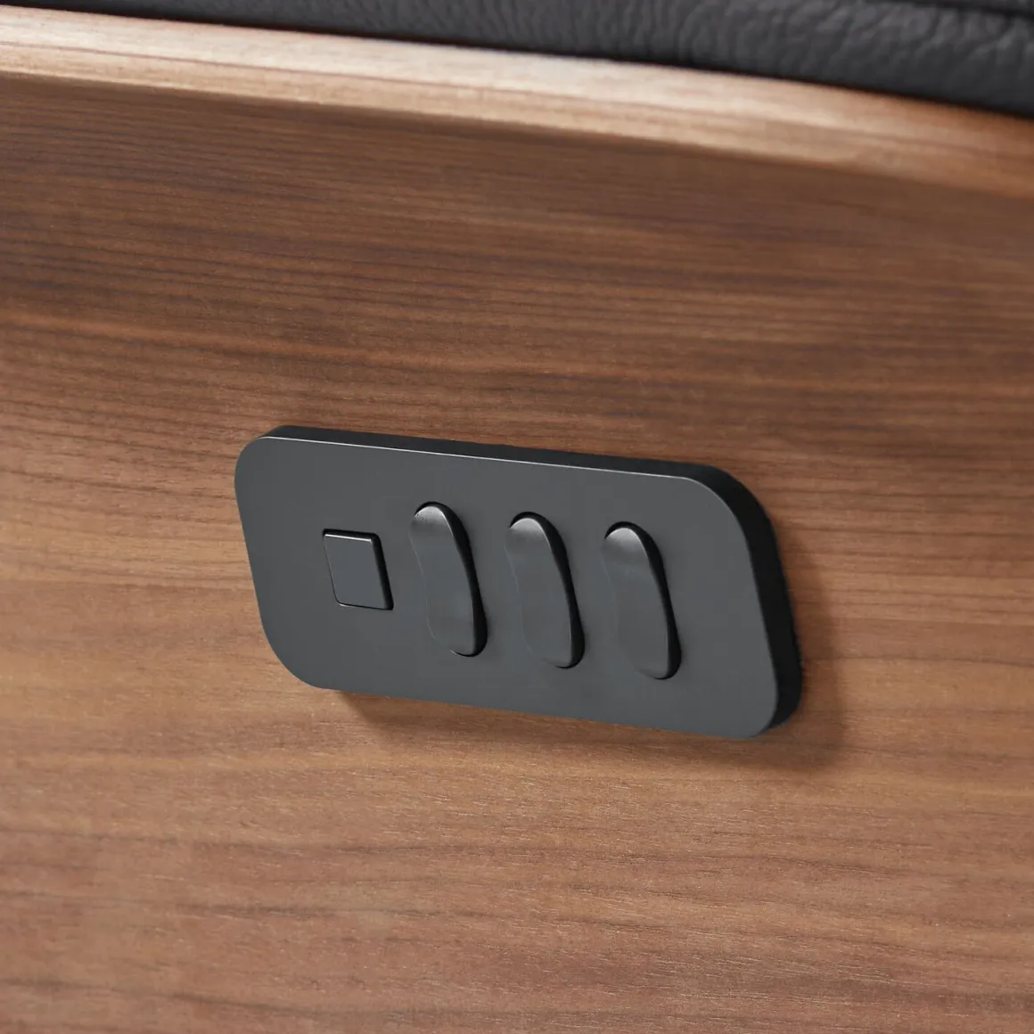 | Uitvoering | Uitgevoerd in leder soleda 441-black met elektrisch verstelbare rugleuning, voetensteun en hoofdsteun (3-motorig), armschaal in kleur nut oiled, bedieningsknoppen in kleur zwart, HR-koudschuim met een toplaag van traagschuim in de zitting, HR-koudschuim met een toplaag van traagschuim in de rug en zwarte metalen 5-teensvoet (voet D, model EBS). |
