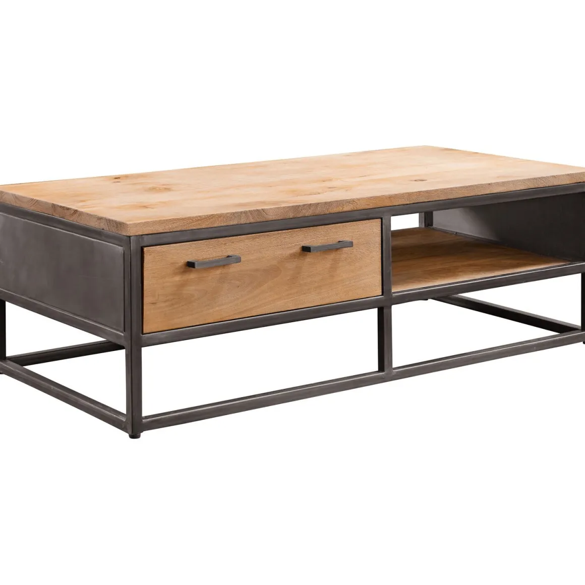 Salontafel Mesola is een trendy tafel met een industriële uitstraling. De warme, lichtbruine kleur en het metalen frame zorgen voor een unieke sfeer in je woonkamer. Deze robuuste tafel is gemaakt van massief mangohout. Dit hout heeft een natuurlijke uitstraling met verschillende lijnen, nerven en kleurschakeringen. Hierdoor is ieder meubel uniek. Het hout is afgewerkt met een transparante lak, zodat er niet snel vlekken op ontstaan en het onderhoud eenvoudig is.