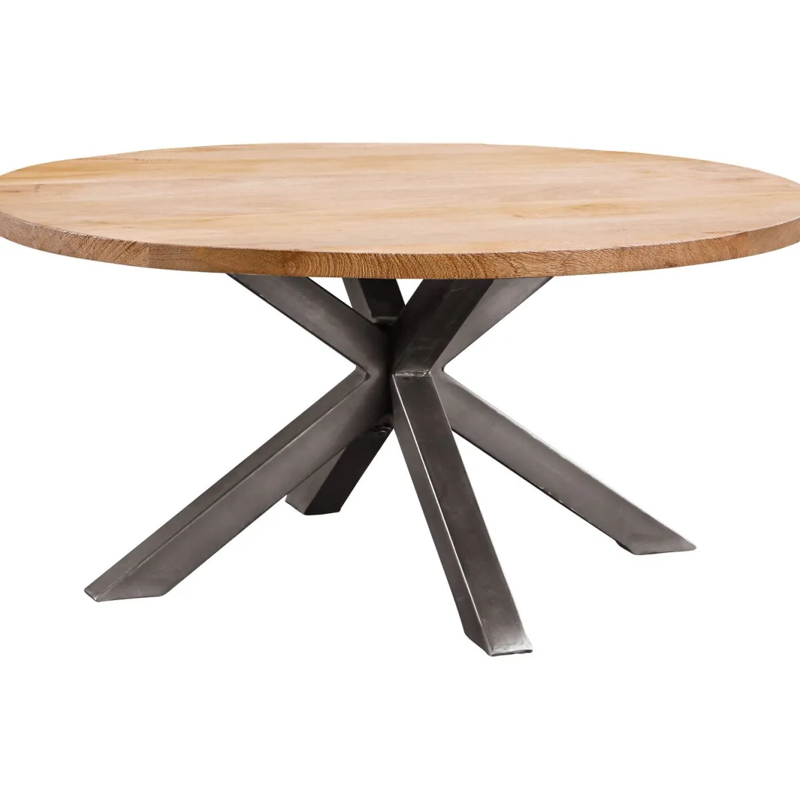 | Uitvoering | Uitgevoerd met een rond blad (3 cm dik) in mangohout natural en een antique metalen spinpoot (5×5 cm). |