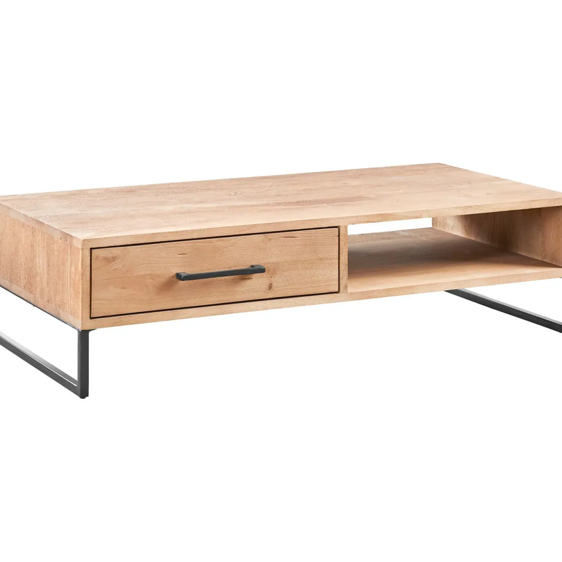 | Uitvoering | Uitgevoerd in gezandstraald mangohout in de kleur warm naturel en een zwart metalen frame, met 1 lade en 1 open vak. |