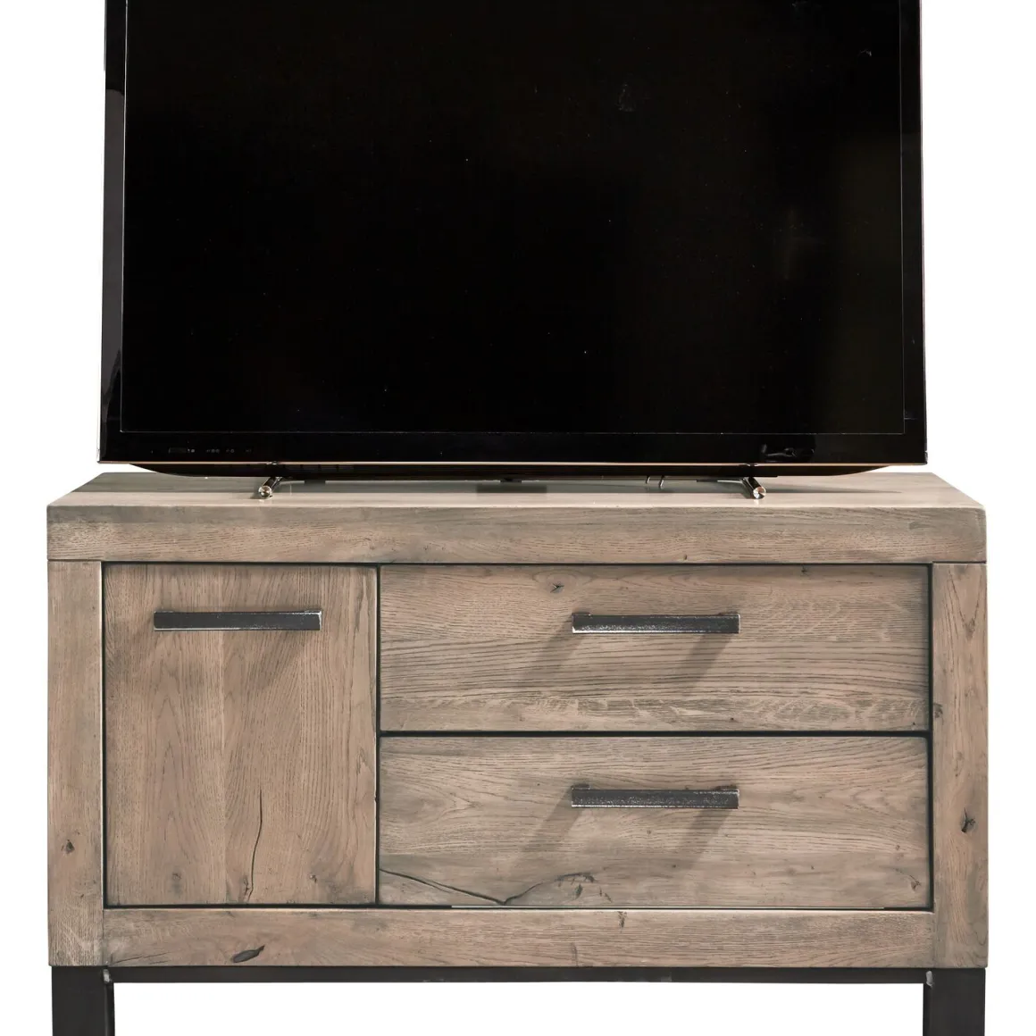 Dit robuuste tv-meubel Hevano is gemaakt van eikenhout met een grof gelast stalen onderstel. Eikenhout kenmerkt zich door de fijne nerf, vlamtekening en de wisselende kleurschakering. Elke boom heeft een eigen uitstraling door de groei en weersinvloeden. Structuur, nerfschakering, windbarstjes, haarscheurtjes en de aanwezigheid van grote en kleine knoesten getuigen van jarenlange groei en maken het hout van de boom authentiek.