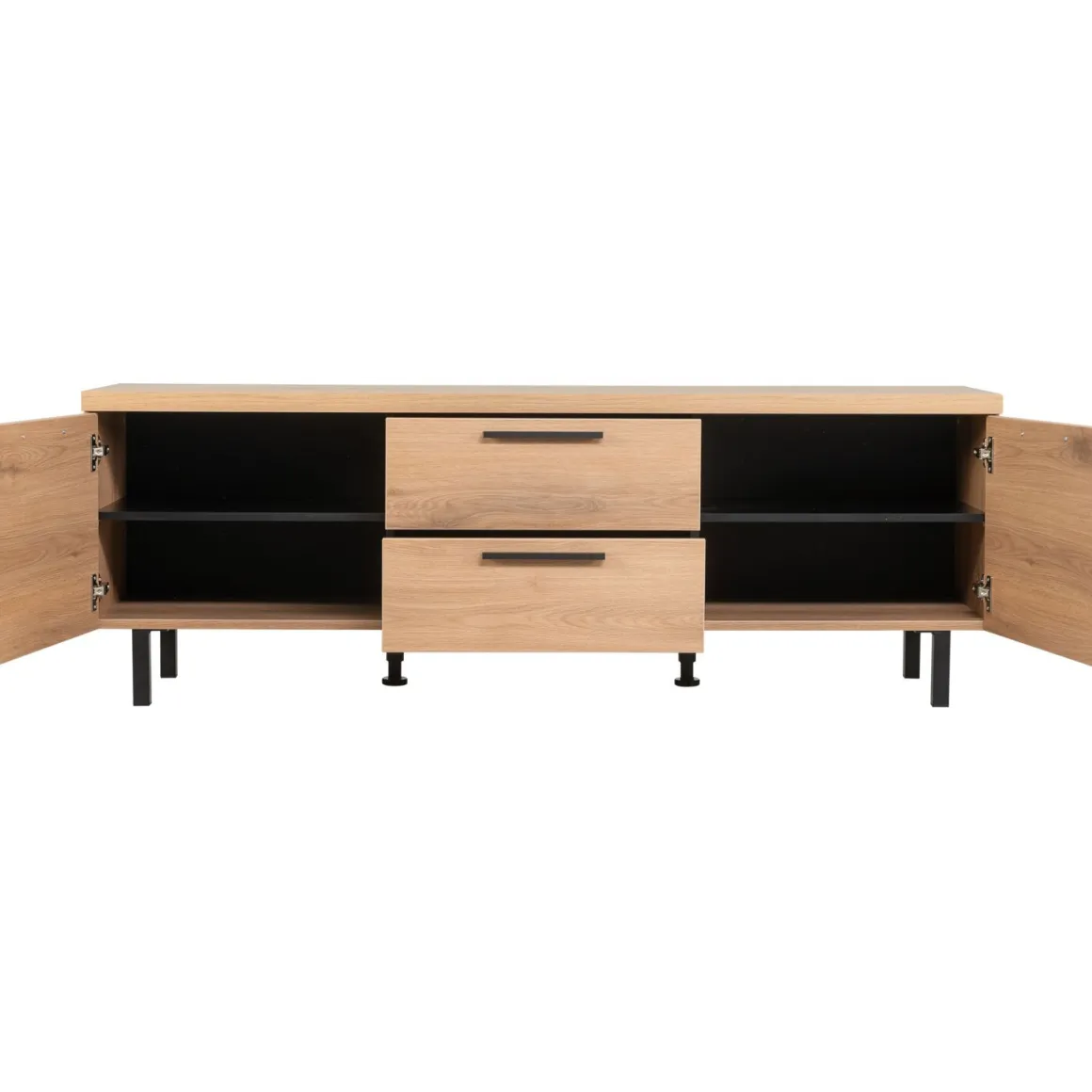 | Uitvoering | Uitgevoerd in melamine Natural Canella Oak decor met zwart metalen handgrepen en poten met 2 deuren en 2 laden. |