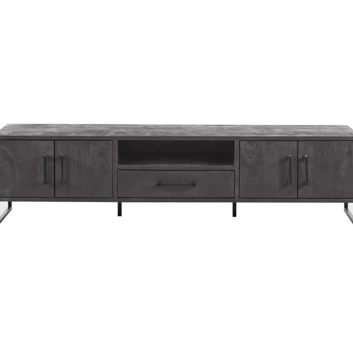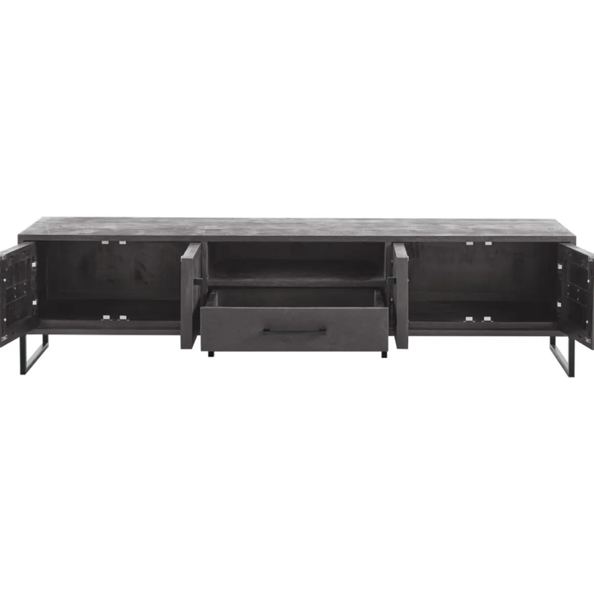 | Uitvoering | Uitgevoerd in gezandstraald mangohout in de kleur deep black en een zwart metalen frame, met 4 deuren, 1 lade en 1 open vak. |