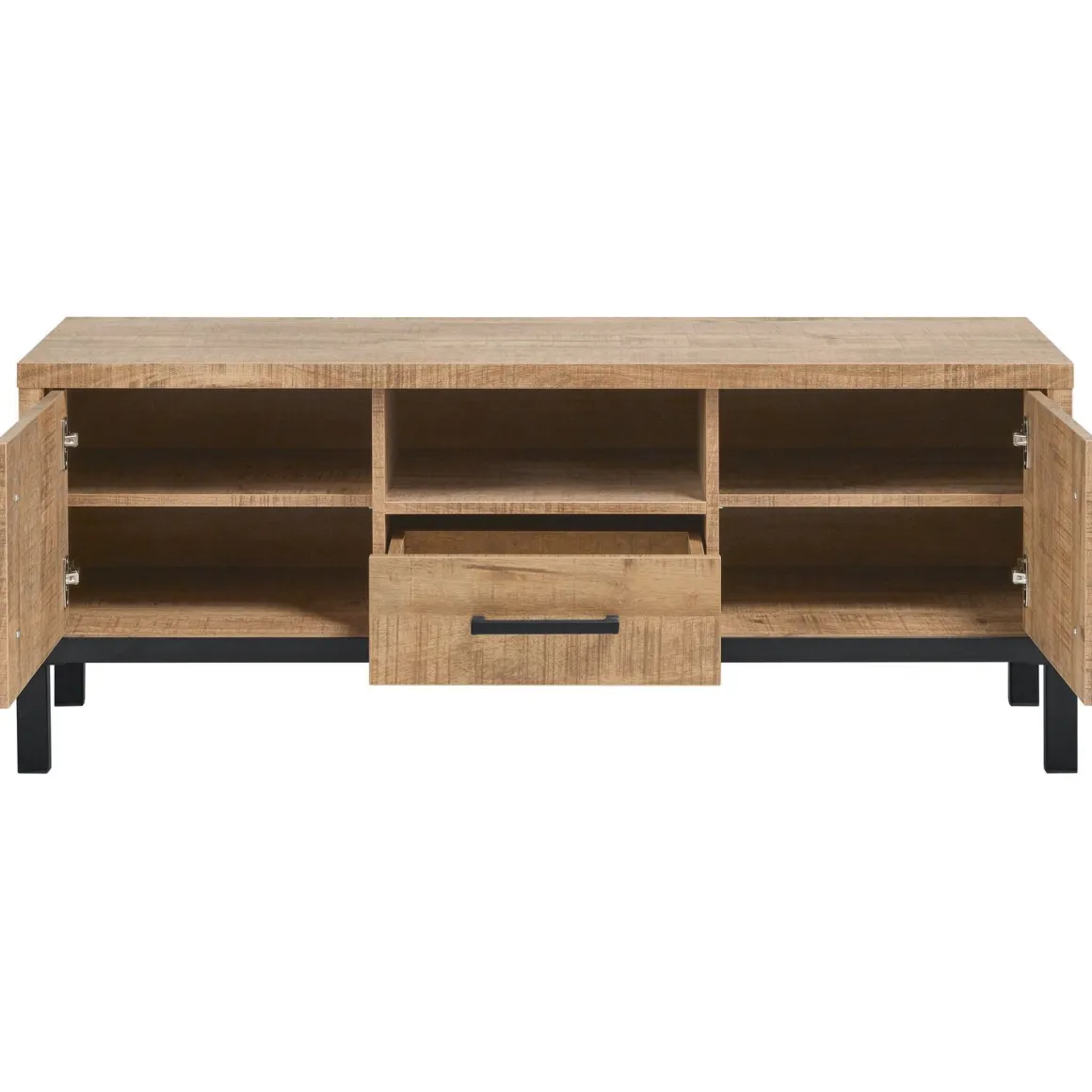 | Uitvoering | Uitgevoerd in melamine met mango decor in combinatie met zwart metalen frame, met 2 deuren, 1 lade en 1 open vak. |