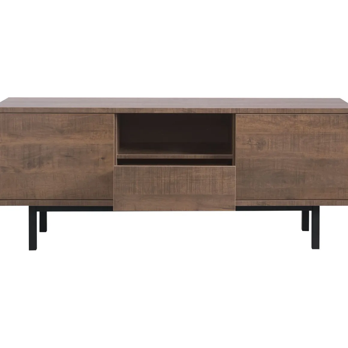 | Uitvoering | Uitgevoerd in melamine met dark mango decor in combinatie met zwart metalen poten met 2 schuifdeuren, 1 lade en 1 open vak. |