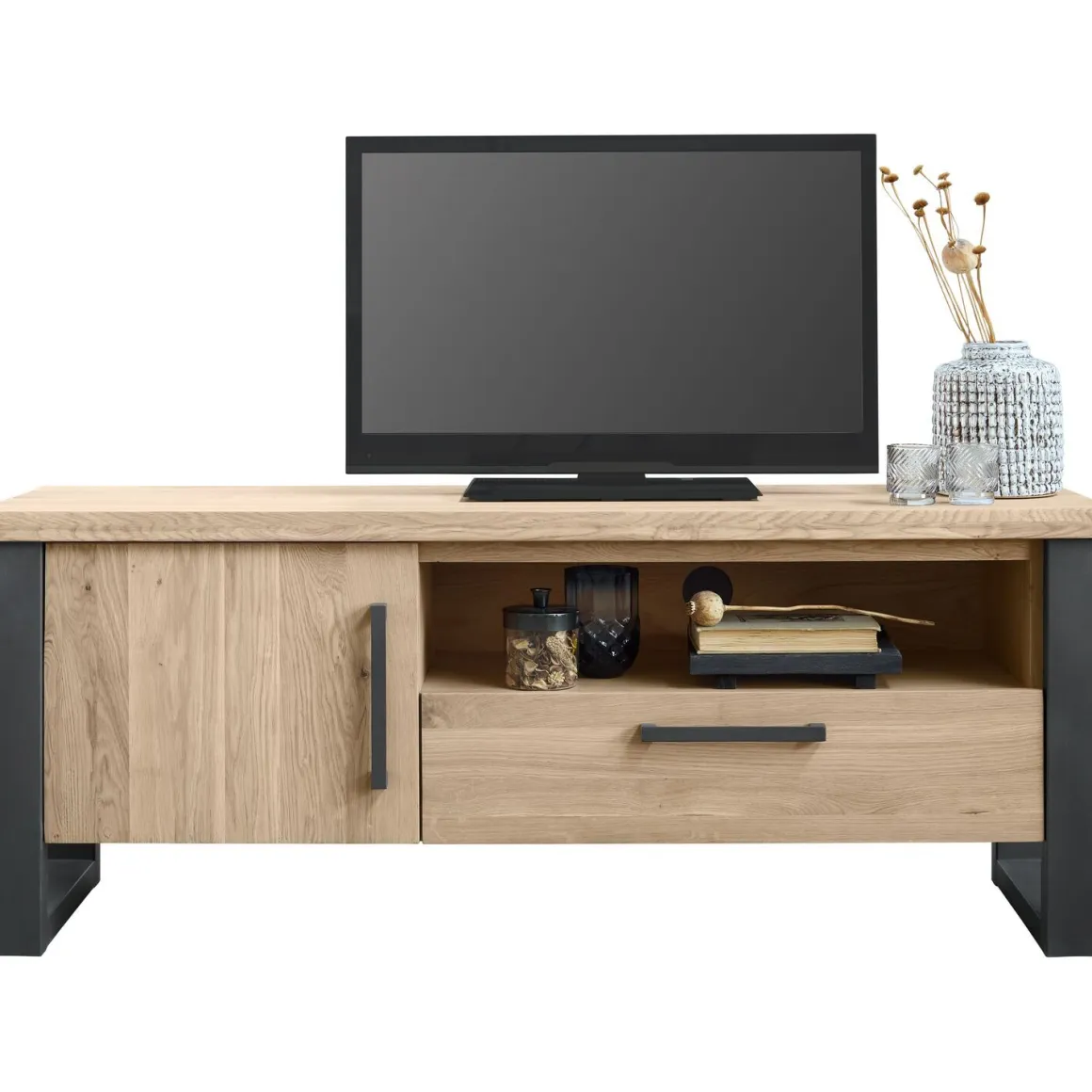 Dit industriële tv-meubel Verato is gemaakt van eikenhout met een metalen frame. Eikenhout kenmerkt zich door de fijne nerf, vlamtekening en de wisselende kleurschakering. Elke boom heeft een eigen uitstraling door de groei en weersinvloeden. Structuur, nerfschakering, windbarstjes, haarscheurtjes en de aanwezigheid van grote en kleine knoesten getuigen van jarenlange groei en maken het hout van de boom authentiek.