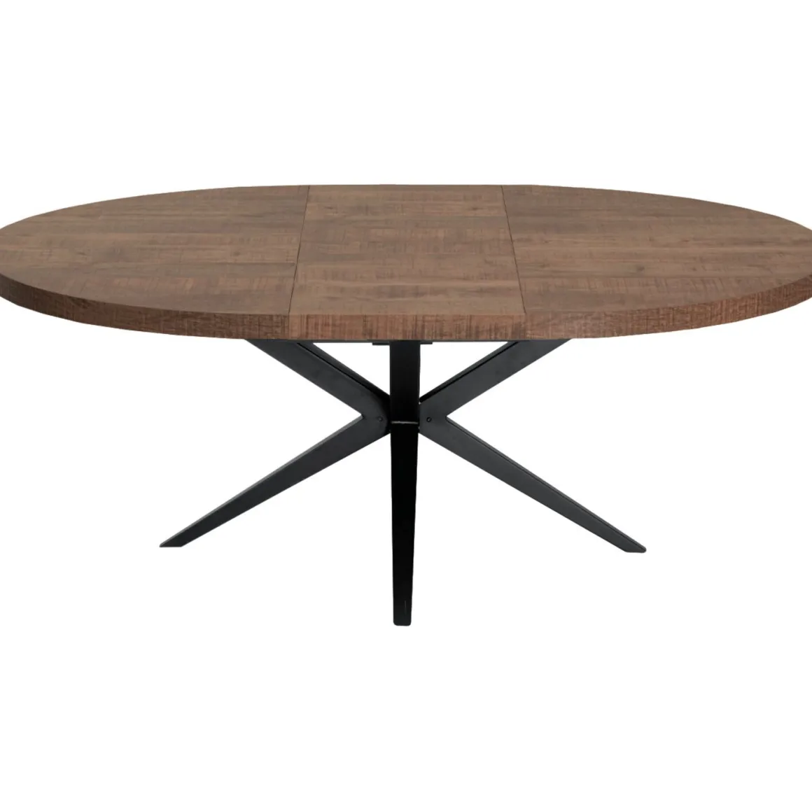 Met een doorsnede van 130 cm is deze ronde tafel ideaal voor kleinere kamers. De tafel is uitgevoerd in de kleur Dark Mango en heeft een melamine blad met een strakke zwarte randafwerking, wat zorgt voor een moderne en luxe look. De zwarte metalen spinpoot geeft de tafel een robuust karakter en biedt veel beenruimte. De tafel is uitschuifbaar tot 170 cm en krijgt dan een ovale vorm. Bij gebruik van smalle stoelen kunnen er dan tot 8 personen aan tafel. De onderregel op ca. 73 cm hoogte zorgt ervoor dat de meeste eetkamerstoelen er moeiteloos onder passen.