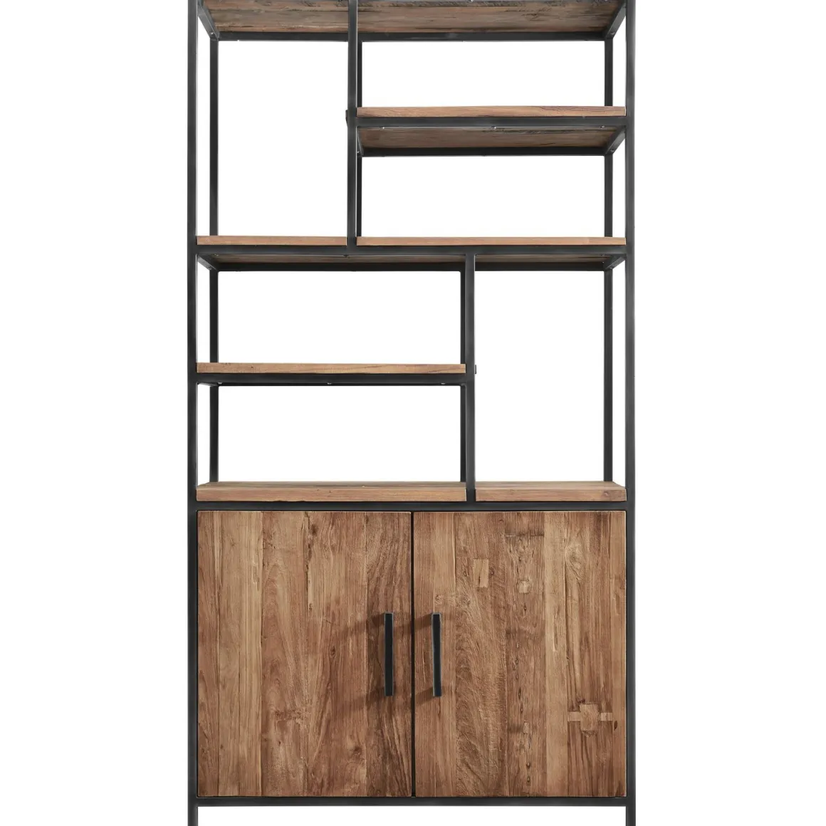 | Uitvoering | Uitgevoerd in teakhout mix rough, met 2 deuren, 6 open vakken en metalen frame. |