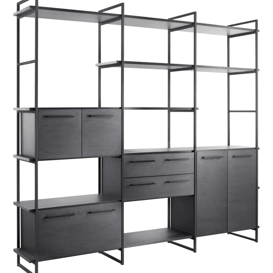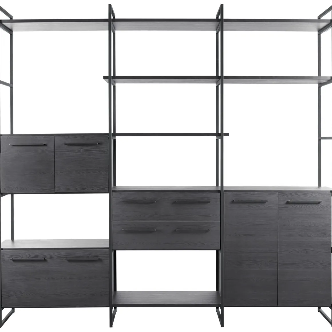 Deze kast combineert een strak zwart metalen frame met chique accenten in de kleur noir, een zwart houtdecor met een elegante en moderne uitstraling. De set bestaat uit vier zwarte metalen staanders, vier legplanken van 244 cm breed, twee legplanken van 166 cm breed en vier inzetkasten: één hoge inzetkast met twee deuren, één met één lade, één lage inzetkast met twee deuren en één met twee lades. Afmeting: H226 x B244 x D45 cm. Je zet de kast eenvoudig zelf in elkaar. Alle onderdelen zitten overzichtelijk in één pakket met een duidelijke montagehandleiding. De inzetkasten zijn al voorgemonteerd.