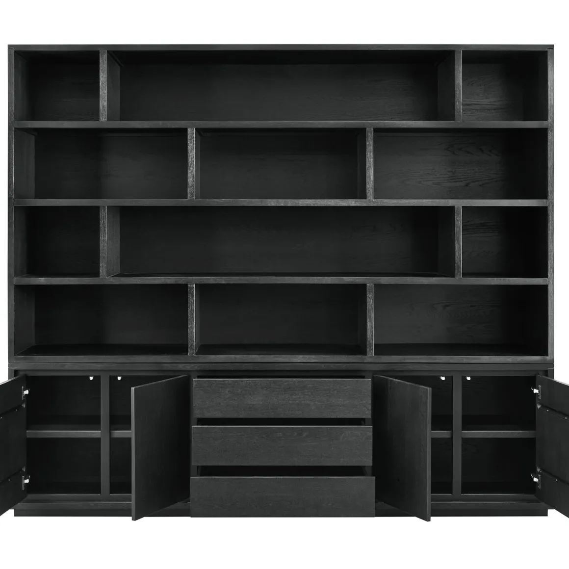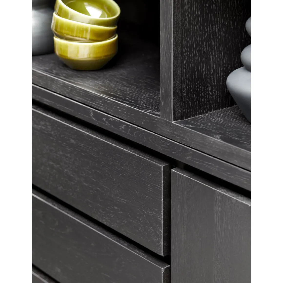 | Uitvoering | Uitgevoerd in eiken in de kleur 60.2 black met 4 deuren, 3 laden en 12 open vakken. |